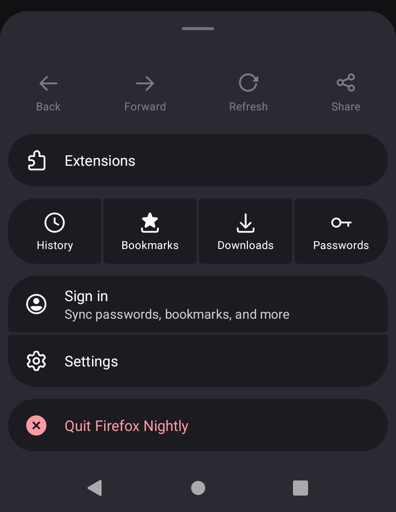 mustbe3to20signs@feddit.org to Firefox@lemmy.ml · 2 months agoWhat do you think about the new menu of Firefox Android?lemmy.mlimagemessage-square96linkfedilinkarrow-up1154arrow-down13file-text