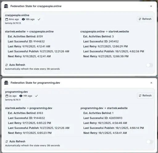 Noticed yesterday that a post to a community on programming.dev wasn’t getting any traction. Not even the single downvote every post gets. Same for a post to crazypeople. Looked at the communities on their respective home instances, and neither were there. So I pulled up the federation stats, and both were 6,000-ish behind and now that’s up to 8,000-some on both.