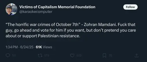 If someone is so terminally online that they’re decrying Zohran Mamdani as being insufficiently left for critical support on the grounds of ‘acknowledging Hamas performed war crimes on Oct 7’, they desperately need to touch grass.