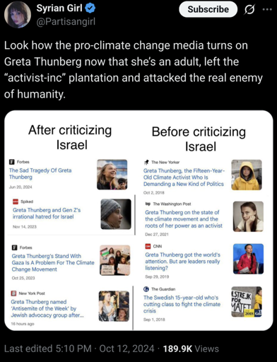 [Image, generated description: A split-screen image presents a visual comparison, with two distinct columns. The left column, labeled “After criticizing Israel,” features headlines from news sources such as Forbes, Spiked, and the New York Post. These headlines, dated in 2023 and 2024, discuss Greta Thunberg and her views, with titles suggesting negative sentiment towards her. Accompanying these headlines are small thumbnail images of Thunberg, depicting her in various contexts. The right column, labeled “Before criticizing Israel,” showcases articles from The New Yorker, The Washington Post, CNN, and The Guardian, dating from 2018 to 2021. Headlines from this section introduce Thunberg’s activism, climate change advocacy, and praise. Thumbnails here also portray Thunberg, likely from earlier in her career. The image employs a clean, organized layout with white backgrounds and clearly defined columns. The overall impression is a side-by-side comparison illustrating a shift in media portrayal based on the subject’s actions.]