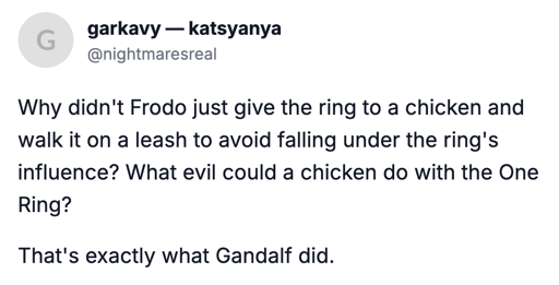 Yeah, Boromir was tempted by the ring just by proximity. Nevermind, how a person plans to make a chicken cooperate with heading into a blasted hellscape and up a volcano.