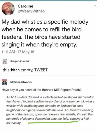 Now I need the bird species to be part of the story. Most songbirds are unable to learn new whistles. Corvids (crows, ravens, magpies, mockingbirds, cat birds, etc.) are a common family that is an exception, but generally they don’t come to feeders. If it was a corvid, what was this guy putting in his feeder? Parrots are another major exception, and they will come to feeders, but they aren’t native wildlife in many parts of the world. If it was a parrot, where did this guy live?