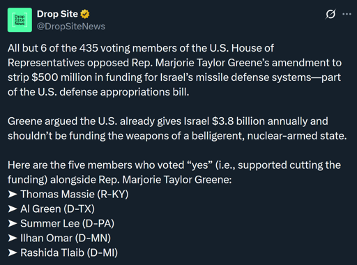 arrow-up1119arrow-down1imageAOC voted against MTG’s amendment to strip Israel funding from the Defense Appropriations Act of 2026lemmy.mlgeneva_convenience@lemmy.ml to United States | News & Politics@lemmy.ml · 3 months agomessage-square106linkfedilinkcross-posted to: progressivepolitics@lemmy.world