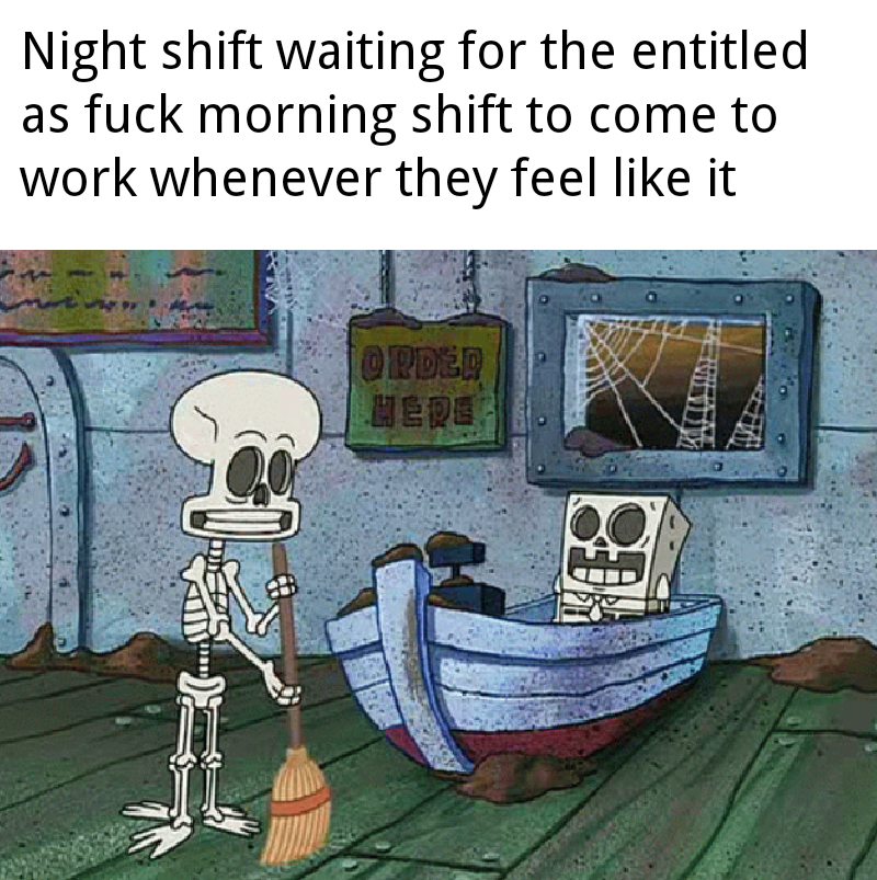 sascuach@lemmy.ml to Antiwork@lemmy.ml · 3 年前Night shiftlemmy.mlimagemessage-square0linkfedilinkarrow-up11arrow-down10