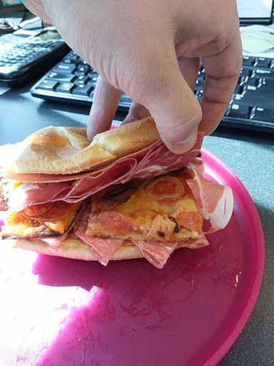 …just add pizza! Square cut works best. I actually have a history of using pizza for bread, adding a big slice to an italian hoagie, or…the original…wrapping a jimmy johns #9 in a monster slice from Bacci’s. Two loves combined.