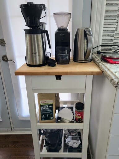 Our kitchen is small and we have always struggled with counter space. Saw these carts when shopping so I bought one and assembled it. I put all of our coffee and tea stuff on the cart.