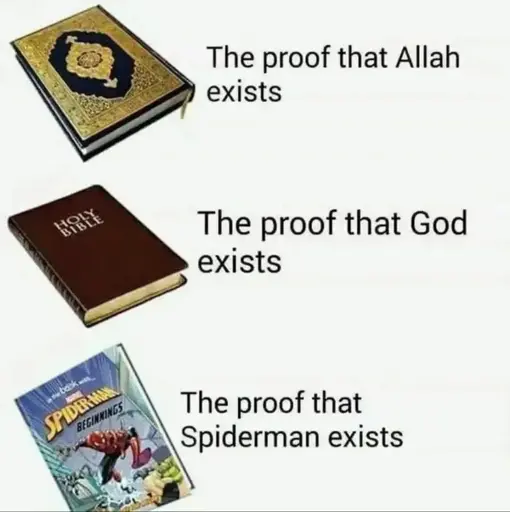Bible believers and quran believers actually do point at their books and claim they are proof of their religion. No spider-man (there, I added the hyphen for you) reader, religious or not, big comic nerd or not, would ever say the comic is proof of spider-man’s existence because of course that’s ridiculous. So adding spider-man to this meme does make a lot of sense - putting them in contrast, hoping to make people understand how illogical it is to treat certain man made works of fiction so completely differently than others.