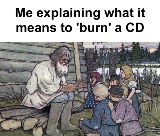 The ‘CD’ part is like your brain, where the ‘burn’ causes microplastics to melt in a pattern that stores data.”“Now kids, can anyone tell me why the historians often say ‘CDs nutz’?”