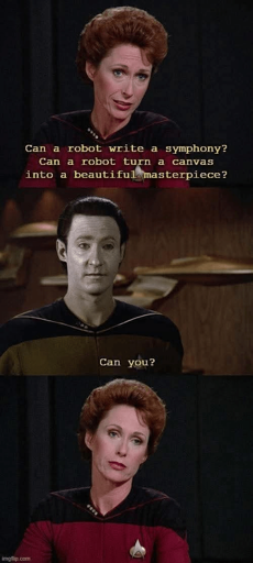 That burn 😂😂😂 And the fact that Data actually paints stuff, and plays musical instruments (I don’t know if he ever created a music of his own) and wrote poetry of his own (the quality of it is debateble but still he already did more than her)