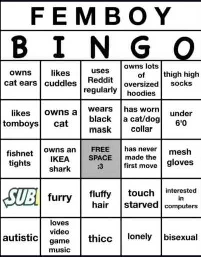 I manage to check 11 boxes without a bingo. Granted I am not a femboy so I think it checks out