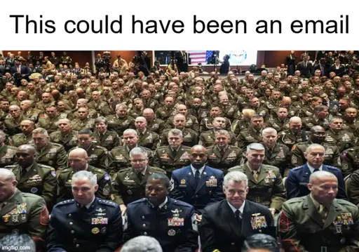 Let’s have every single general, admiral, and other very high ranking military personnel in the same room with the secretary of war and the president. Oh, and let’s announce it publicly ahead of time. What could go wrong?
