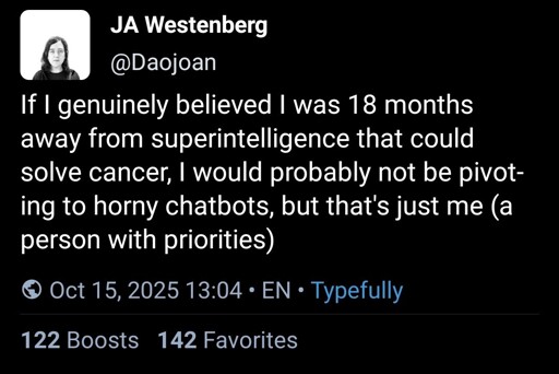arrow-up11.31Karrow-down1imagespeak for yourselfslrpnk.netblibla@slrpnk.net to Microblog Memes@lemmy.worldEnglish · 12 days agomessage-square143linkfedilinkfile-text
