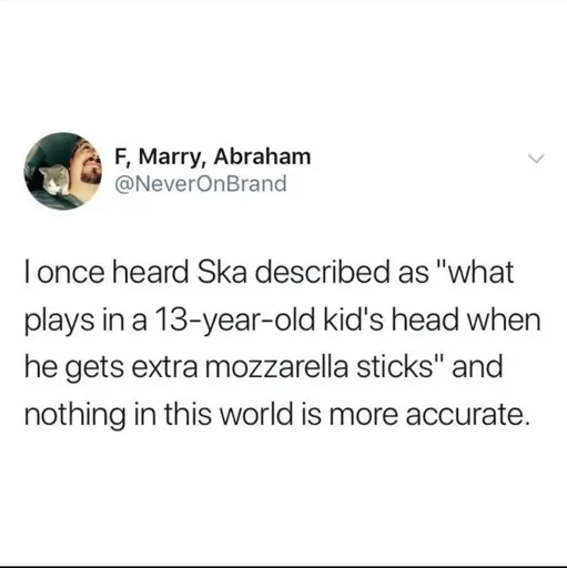 arrow-up1708arrow-down1imageSka still slaps thoughlemmy.dbzer0.comStamets@lemmy.dbzer0.com to People Twitter@sh.itjust.works · 10 days agomessage-square88linkfedilink