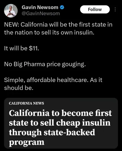 california has been looking for a low cost insulin for a few years, i think they were moving towards this for a while. the resistance is coming from the trioply that owns the other formulations of insulin.