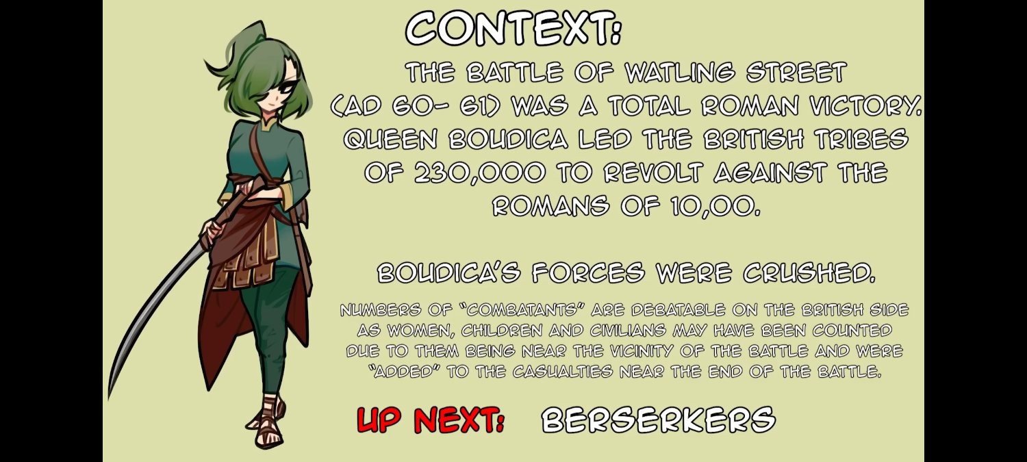 - Context: The Battle of Watling Street (AD 60-61) was a total Roman victory. Queen Boudica led the British tribes of 230,000 to revolt against the Romans of 10,00(0). Boudica’s forces were crushed. - Numbers of “combatants” are debatable on the British side as women, children and civilians may have been counted due to them being near the vicinity of the battle and were “added” to the casualties near the end of the battle.