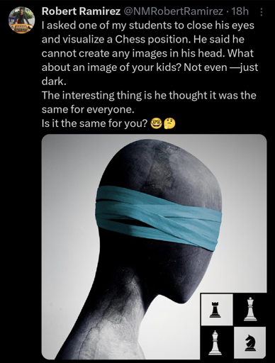 I practiced with a friend at the same general skill level that was very good at playing sans voir, which incidentally is how I realized I don’t have the same mental imagery as him. This was ~25 years ago, and I didn’t run into the word aphantasia until around 2020.