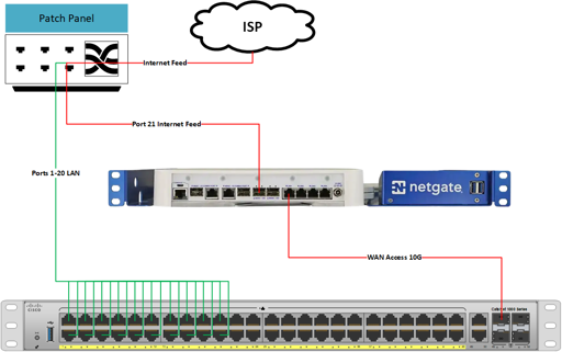 The patch panel has LAN cables I installed in the walls on ports 1-20. The ISP feed comes into the patch panel on port 21.