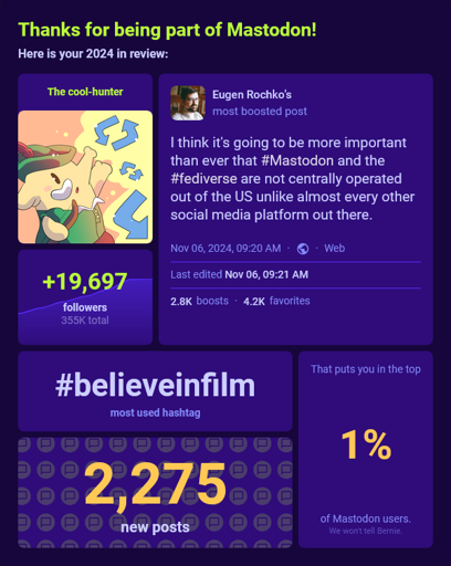 Fediverse Champion@lemm.eeOPto Fediverse@lemmy.world•Wrapstodon - a new mastodon year end review is hereEnglish1·10 months agoIt’s only in the nightly builds, so unless you’re on mastodon.social or a server with the latest build you won’t see it yet.