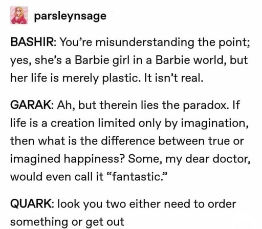 As for a cooking show, don’t threaten me with a good time. Let’s see Latinum Chef Romulus’ reaction when the challenge ingredient is leola root.